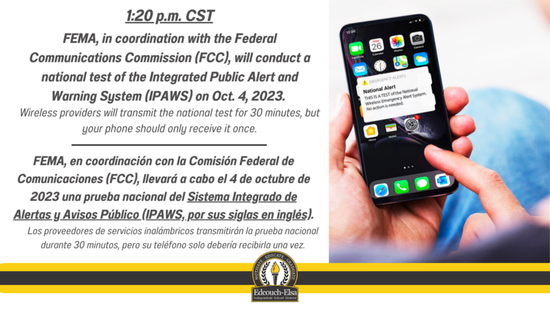 October 4, 2023 - At 1:20 p.m. CST, FEMA, in coordination with the Federal Communication Commission (FCC) will conduct a national test of the Integrated Public Alert and Warning System (IPAWS).